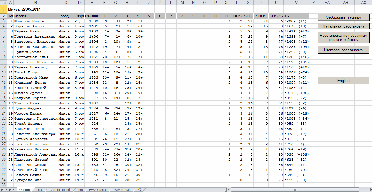 Здесь, опираясь на данные из листа Input, рассчитываются очки и коэффициенты. На основе этих расчетов строки могут быть отсортированы в нужном порядке, в том числе итоговом. Чтобы это делать быстро, без лишних телодвижений, справа есть кнопки в помощь. Коэффициенты – это SOS (к-т Бухгольца), SDOS (к-т Бергера), SOSOS (сумма к-тов Бухгольца). Приоритет к-тов в итоговой расстановке возможен только в том порядке, что я записал выше (другие к-ты или другой приоритет потребуют изменения в коде).