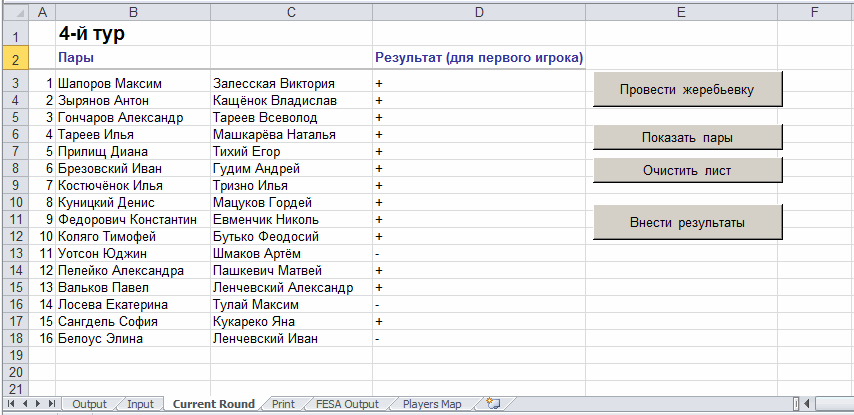 6) По прошествие тура, на листе Current Round заполняем результаты в колонке Результат. Следует указать итог игры для первого в паре игрока (+, - или =). После заполнения, чтобы перенести данные с листа Current Round на лист Input, нажимает кнопку Внести результаты.
